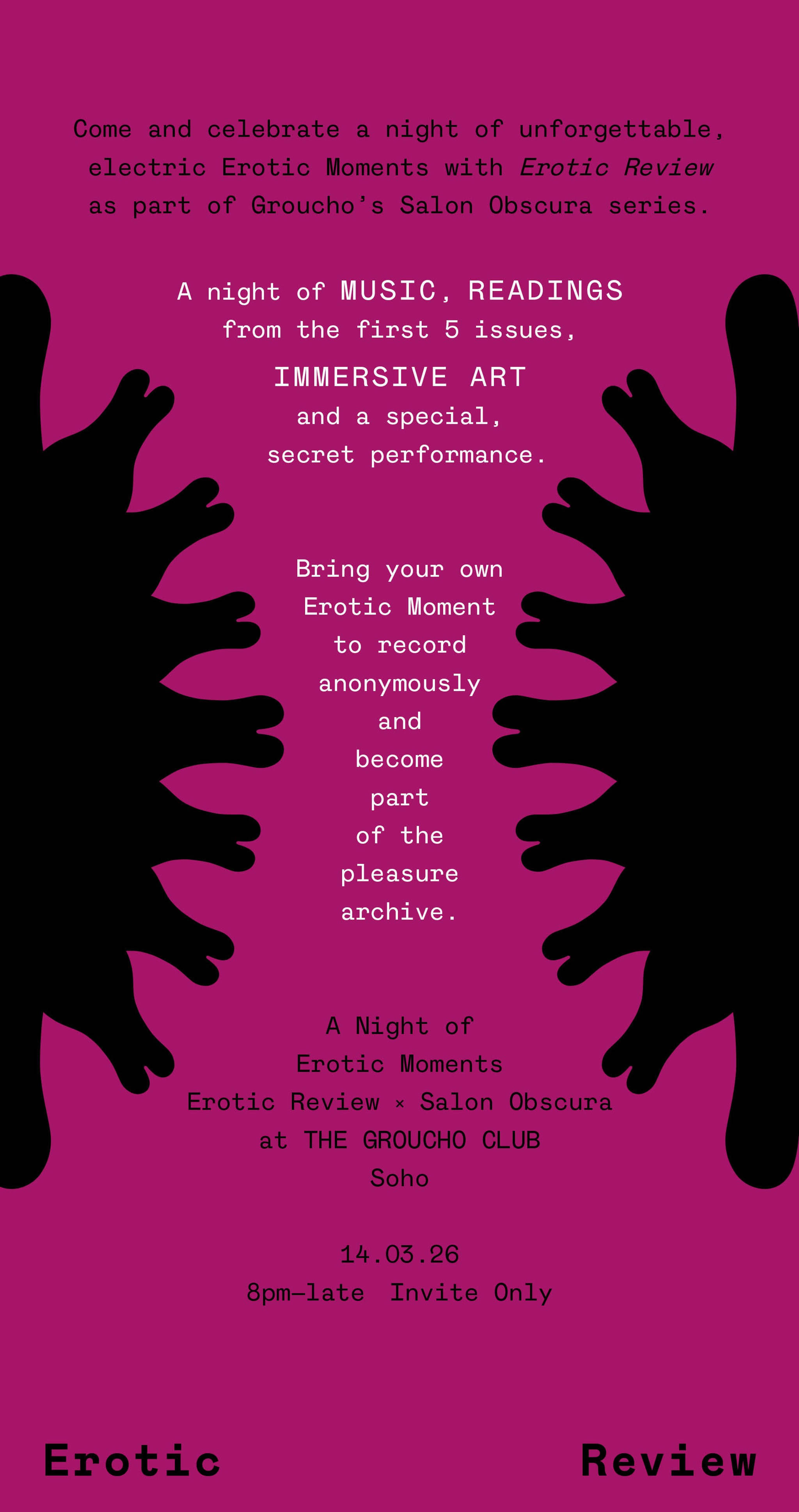 On 14 March, come and celebrate a night of unforgettable, electric Erotic Moments with the Erotic Review as part of The Groucho’s Salon Obscura series. A night of music, readings from the first 5 issues, immersive art by Chang Gao and a special, secret performance. And the rare opportunity for you to anonymously record your own Erotic Moment...