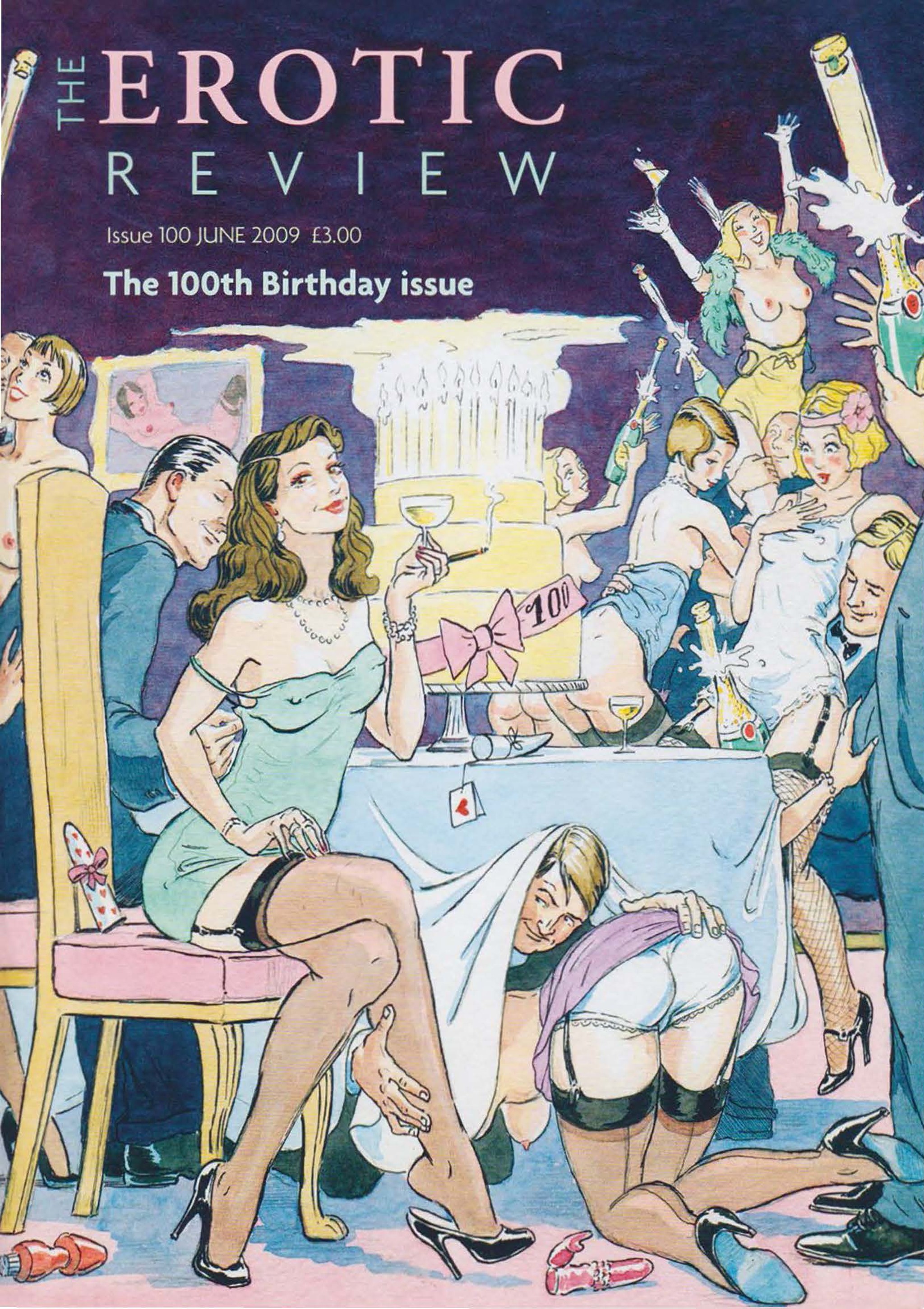 There’s an old cover of the Erotic Review (Issue 100 from June 2009) that depicts a birthday lunch to celebrate the magazine’s 100th edition. The scene is one of revelrous, risqué chaos: women with their tops off pop bottles of champagne, sex toys — seemingly given out as party favours — are strewn across the furnishings, and one woman, seen only from behind (her skirt hoisted up to reveal her stockings, suspenders, and rather sexless knickers) is, to put it crudely, sucking off a man under the table while simultaneously fondling another out of shot.