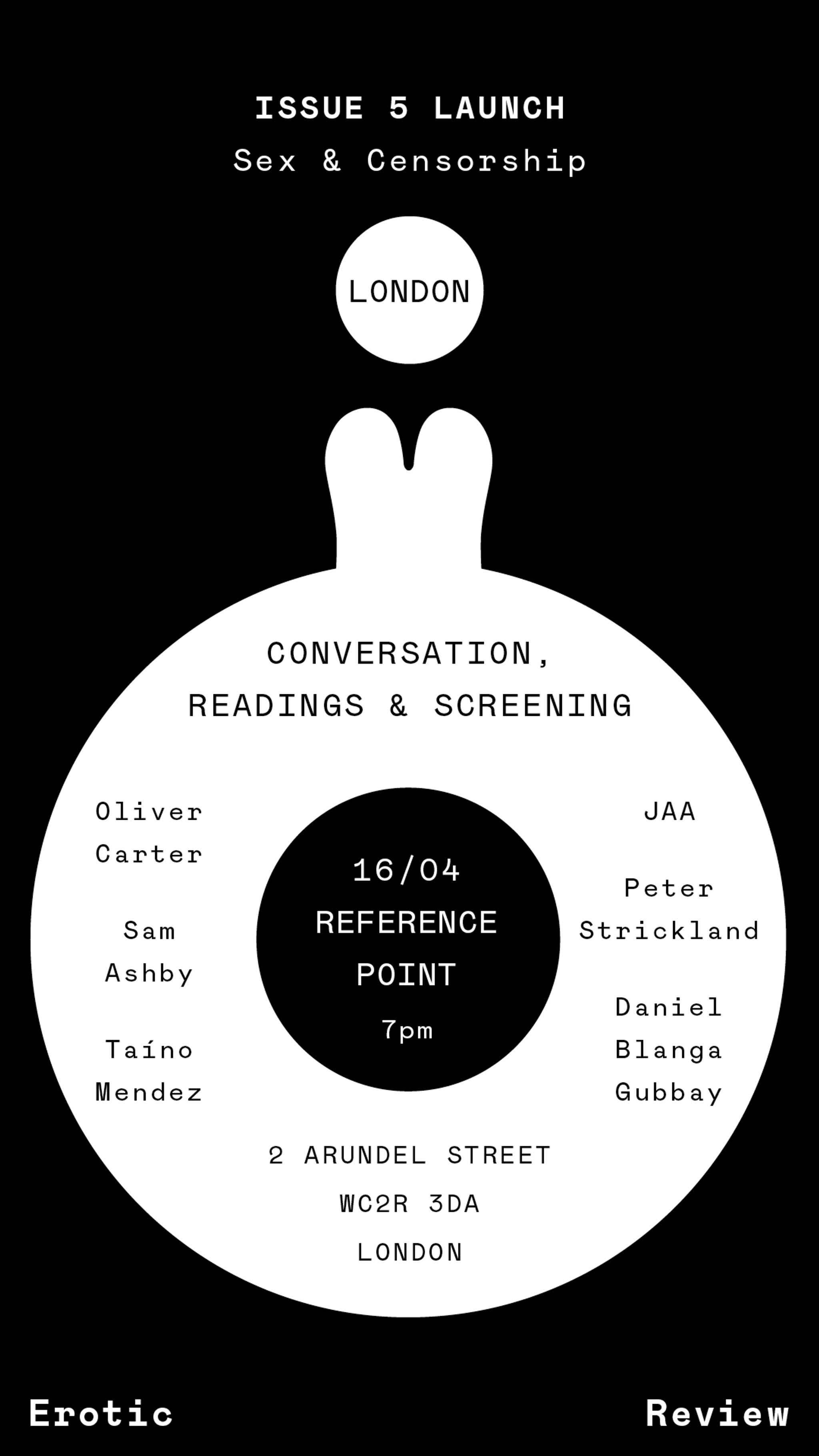 Join us at Reference Point for the launch of the Spring/Summer issue of the Erotic Review, where we're exploring Sex and Censorship. We’ll have readings from Taíno Mendez, Daniel Blanga Gubbay and JAA; discussion between Sam Ashby and Oliver Carter on the Under the Counter archive in the Bishopsgate Institute; and conversation with Sam Ashby, Peter Strickland, Oliver Carter and JAA, hosted by editor Lucy Roeber. Plus music, drinks and conversation.
